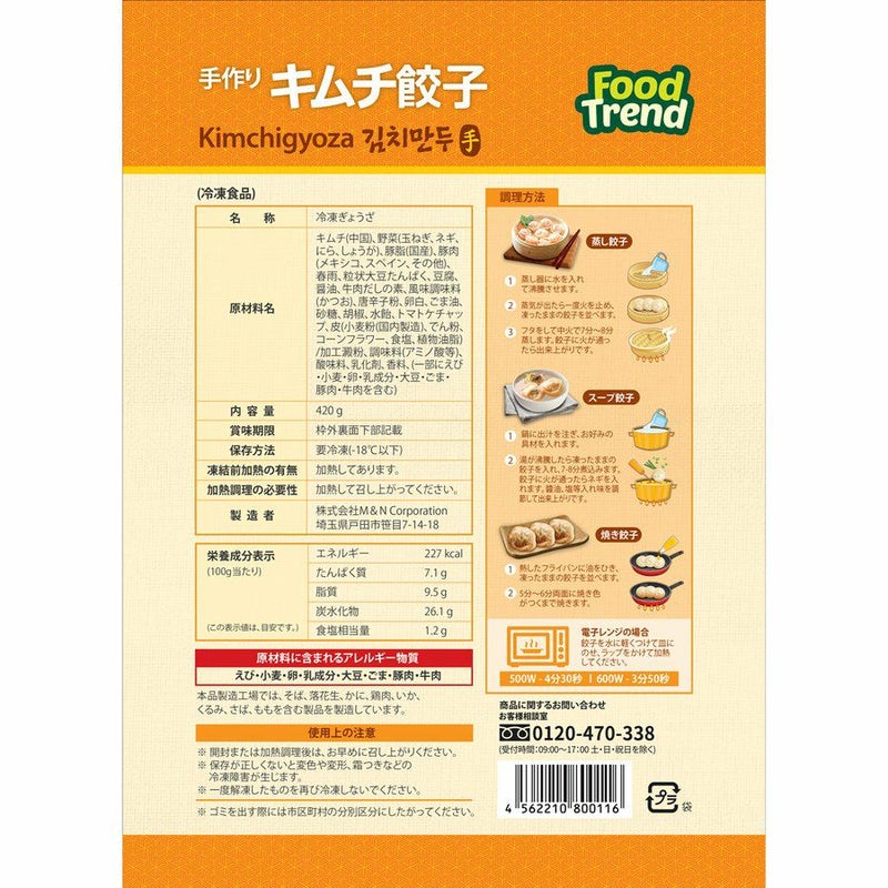 [原材料名] 皮(小麦粉、なたね油、でん粉、食塩)、野菜(玉ねぎ、ネギ、白菜、にら、しょうが)、キムチ、豚肉、豚脂、春雨、豆腐、粉状豆たん白、醤油、ごま油、食塩、こしょう、調味料 ※原材料の一部に卵、小麦、豚肉を含む
