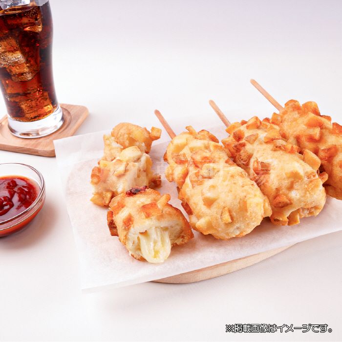 [原材料名] じゃがいも加工品(じゃがいも、植物油脂、ぶどう糖)、プロセスチーズ、小麦粉、植物油脂、砂糖、コーンスターチ、卵白粉、粉乳調製品、食塩、じゃがいも粉、脱脂粉乳/増粘剤(加工でん粉)、膨張剤、pH調整剤、ポリリン酸Na、酵素、塩化Ca、トレハロース、(一部に小麦・卵・乳成分・大豆を含む)