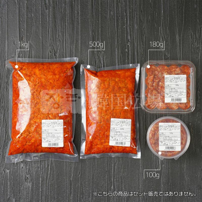 [原材料名] カットチャンジャ、水飴、砂糖、にんにく、いわしエキス、唐辛子粉、みりん、大豆粉、食塩、アミの塩辛、ごま油、ごま、生姜、調味料(アミ酸等)