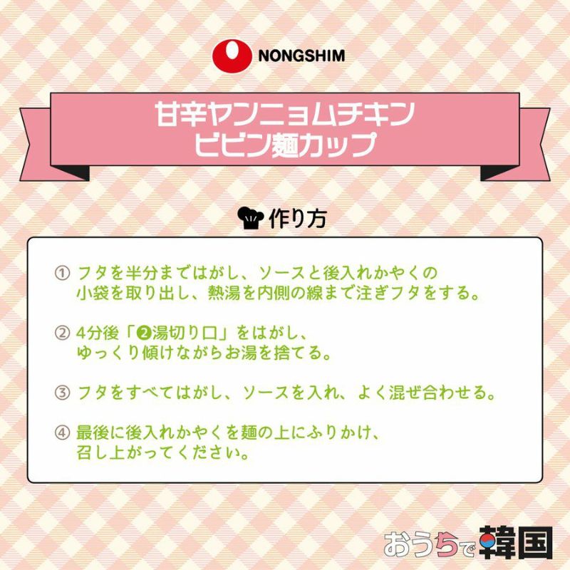 [原材料名] 油揚げ麺(小麦粉、澱粉、植物油脂、食塩、調味酵母エキス)、ソース(水あめ、砂糖、植物油脂、ケチャップ、しょうゆ、チキンエキス、香辛料、コチュジャン、食塩、ヤンニョムチキンソース、ウスターソース、リンゴエキス、蜂蜜、香味油)、かやく(ピーナッツ、キャベツ、パセリ)/加工でん粉、調味料(核酸等)卵殻カルシウム、かんすい、乳化剤、カラメル色素、酸味料、香辛料抽出物、酸化防止剤(緑茶抽出物、ビタミンE)、ビタミンB1、甘味料(カンゾウエキス)、増粘多糖類、ビタミンB2、(一部に小麦・大豆・鶏肉・卵・乳成分・落花生・リンゴを含む)