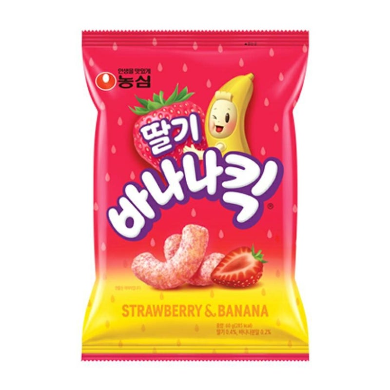 [原材料名] コーングリッツ(遺伝子組み換えではない)、砂糖、植物油脂、濃縮イチゴ果汁、小麦粉、ショートニング、バナナ粉末、ストロベリーパウダー、脱脂粉乳、食塩、卵白粉/香料、着色料(クチナシ)、(一部に小麦・大豆・乳成分・卵を含む)