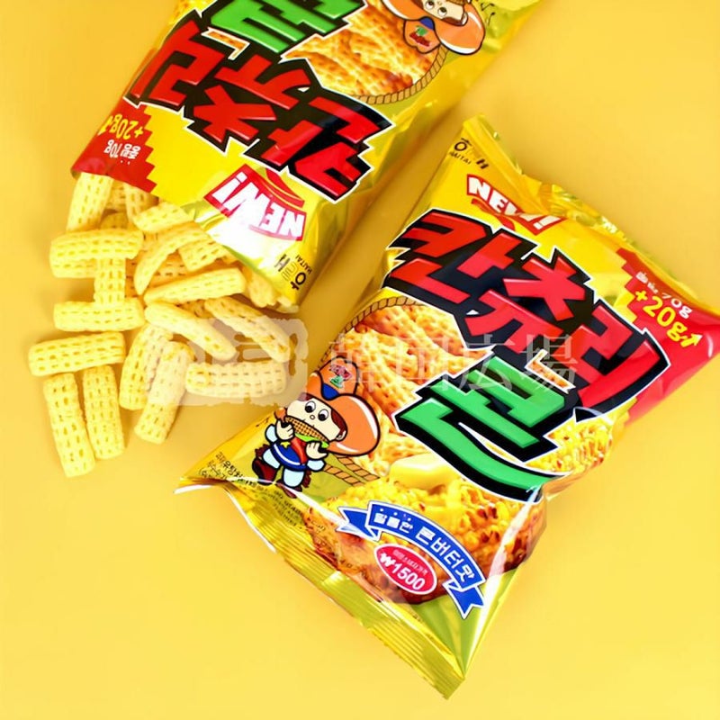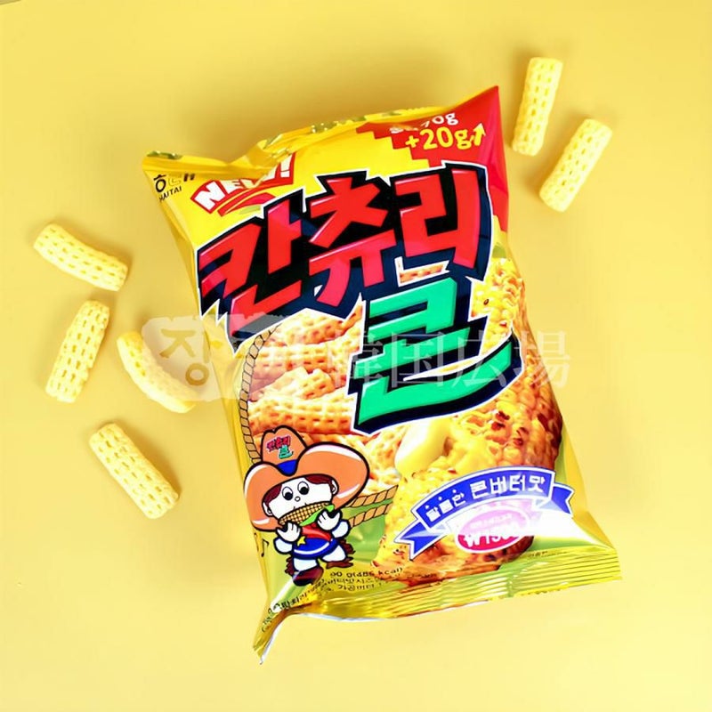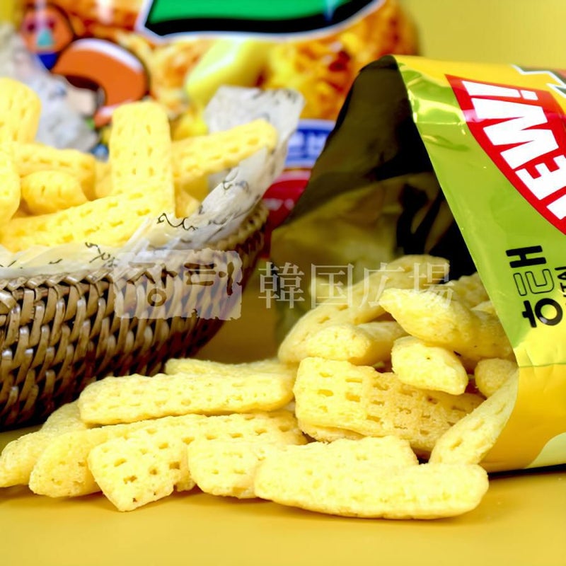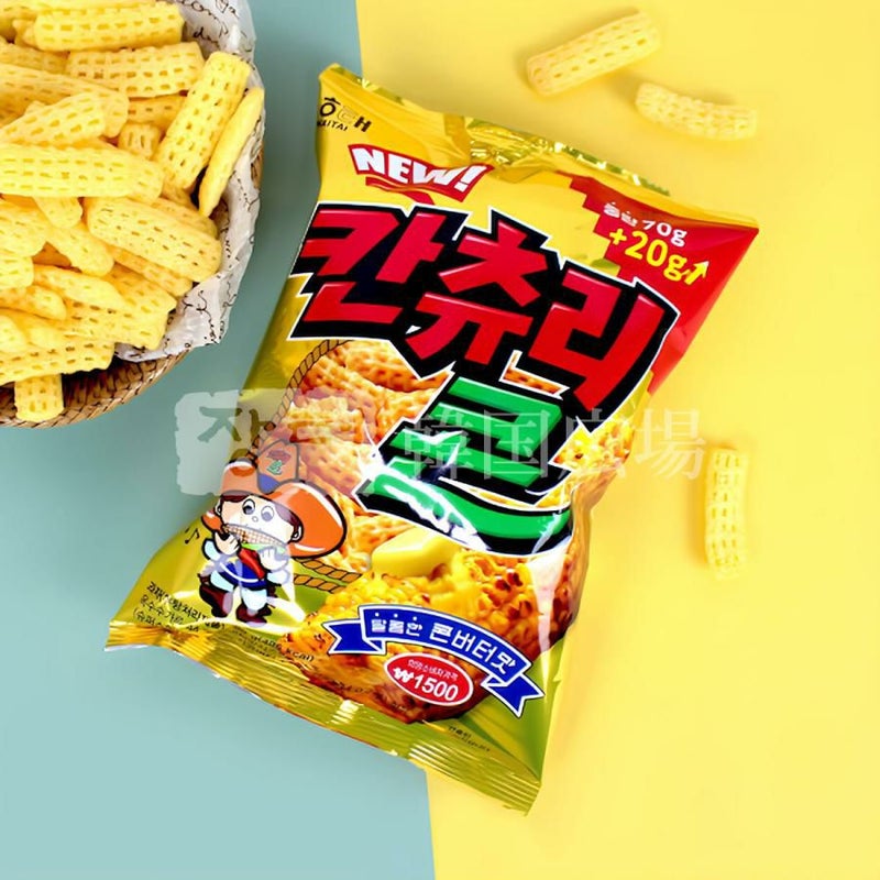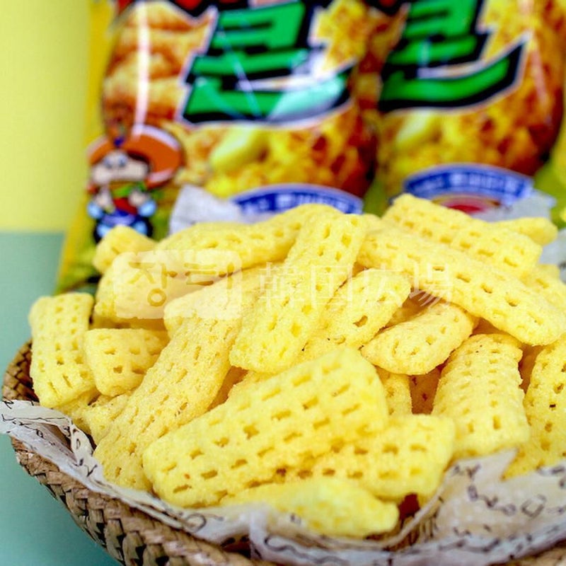 [原材料名] トウモロコシ粉、パーム油、コンバーターシーズニング、小麦粉、砂糖、食塩、マーガリン、水飴、マルチトールシロップ、/加工デンプン、調味料(5'-リボヌクレオチド二ナトリウム)、pH調整剤(L-酒石酸水素カリウム、酸性ピロリン酸ナトリウム)、膨脹剤(塩化アンモニウム)、着色料(クチナシ色素)、ビタミンE、(一部に大豆・乳成分・小麦を含む)