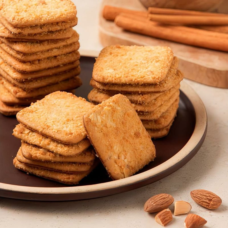 [原材料名] 小麦粉、砂糖、ショートニング、パーム油、スライスアモンド、ブドウ糖、クリームチーズパウダー、全卵液、マーガリン、穀類加工品、水飴、バーター、食塩、ココアパウダー、シナモンパウダー、デンプン、デキストリン / pH調整剤、膨張剤(炭酸水素ナトリウム、Lー酒石酸水素カリウム)、乳化剤、香料(バニリン)、プロテアーゼ