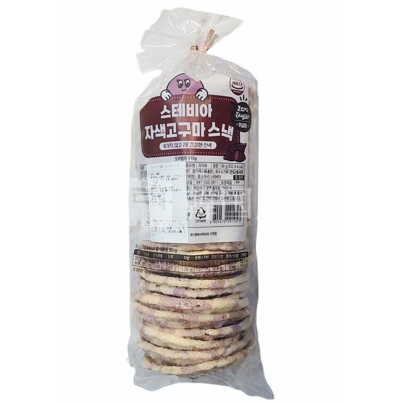 [原材料名] 小麦粉、米粉、トウモロコシ粉、紫いも粉、食塩、製剤水/甘味料(ステビア)、(一部に小麦を含む)
