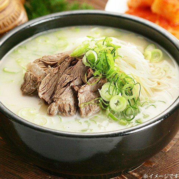 ソルロンタン ソルロンタンは、韓国の代表的な料理のひとつ。 牛の肉・骨を長時間煮込んで作る、乳白色のシンプルなスープ料理。 似た料理としてコムタンがあり、両者とも長時間かけて煮出したスープではあるが、 コムタンと比べ骨が多く入っており、骨髄まで煮出され白濁しているのが特徴。 調理時間 : 5時間以上 1人前カロリー : 500kcal 材料 分量:4人分 主材料:・牛骨(四肢) 1kg、牛すじ 600g、牛タン 700g、湯通し時の水 5kg(25カップ) ・牛肉(胸) 200g、・牛肉(すね) 200g、・煮込み時の水 7kg(35カップ) ・【香味野菜】 長ねぎ 30g、にんにく 65g、生姜 20g、玉ねぎ 50g ・【薬味】 長ねぎ 40g、塩 8g(大さじ?)、胡椒 0.3g(小さじ1/8) ◆下ごしらえ 牛骨・牛すじ・牛タンは、下ごしらえしてきれいに洗い、水に 5~6時間ほどつけ、血抜きをする。 胸肉とすね肉は布巾でふいて、香味野菜はきれいに洗う。 香味野菜は皮を剥いてきれいに洗い、薬味の長ねぎは整えてきれいに洗って輪切りにする。 作り方 1. 鍋に水を入れて10分ほど強火にかけ、沸騰したら牛骨・牛すじ・牛タンを加え、 5分ほど湯通しして水を捨てる。 2. 鍋に水と牛骨・牛すじを入れ、1時間ほど強火にかけて煮立てたら中火に落とし、 5時間ほどじっくり煮る。 煮ている途中に浮いてきたアクと脂を取り除き、牛タン・胸・すねなどの肉を加え、1時間ほど 煮てから香味野菜を加え、さらに1時間ほど煮てから弱火にして30分ほどさらに煮る。 3. 牛タンと牛肉がしっかり煮えたら取り出し、縦4cm、横3cm、厚さ0.2cmぐらいの 茹で肉に切っておき、スープは冷まして脂を取り除いたら、強火で10分ほど沸かす。 4. 汁用の器に切っておいた茹で肉を盛り、汁を注ぎ、薬味を一緒に添えて出す。 料理のポイント ・牛の頭と足・乳房の部位などをさらに入れたりもする。 ・ソルロンタンに玉ねぎと大根を大きく切って入れたりもする。
