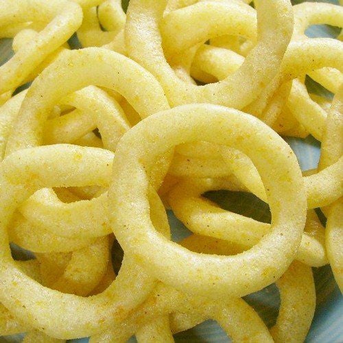 [原材料名] 小麦粉(小麦;米国産)、小麦澱粉(米国産、オーストラリア産)、米油、変性澱粉、パーム油、タマネギ味ベースの粉末(精白糖、粉末セルロース、精製塩、ファイバーゾル、タマネギエキスパウダー) 、タマネギジュース濃縮液、タマネギ、ベーコン味シーズニング、ジャガイモ粉、ビタミンB2