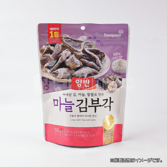 [原材料名] ライスペーパー(でん粉、米粉、食塩)、植物油脂、乾のり、にんにく味シーズニング、白玉粉、食塩/調味料(アミノ酸等)、リン酸Ca、乳化剤、微粒二酸化ケイ素、酸化防止剤(ローズマリー抽出物、チャ抽出物、コメヌカ油抽出物)、クエン酸、甘味料(スクラロース、ステビア)、カゼインNa、香料、pH調整剤、酸味料、(一部にかに・小麦・乳成分・大豆を含む)