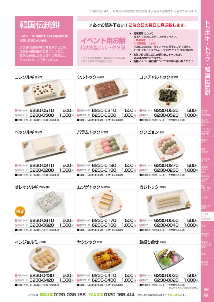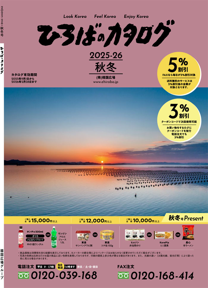 韓国広場カタログ通信販売 〒160-0021 東京都新宿区歌舞伎町2-31-11 TEL:0120-039-168 FAX:0120-168-414 営業時間 : 平日 9:00~17:00 ※当日発送は14時まで(土、日、祝日定休)
